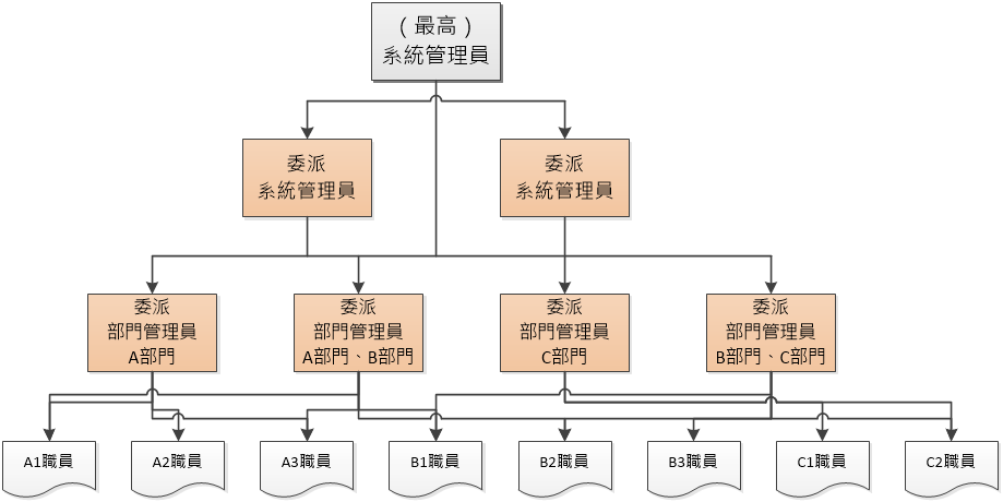 系統允許四種層級的權限管理,並搭配部門之組織人員分類有效管理。主要權限層級如下: